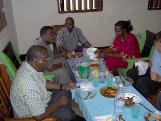 Dounia Marc (seated at the head of the table) had us all over to his house for dinner. Dounia directs the Foyer, the Grace Brethren literature ministry in the CAR, and is responsible for the printing, publishing, and bookstore operations in the country. Part of our goal on this trip was to encourage him and to find ways to assist in getting the publishing ministry further along with better-quality publications, more sales volume, and good business practices. Dounia has served faithfully and well, and several years ago faced terrible disappointment when all his supplies, machinery, and products were destroyed in the country’s civil strife.