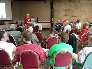 The Central Focus Retreat for Grace Brethren pastors continued today at Mohican State Park Lodge near Loudonville, Ohio. Above, the men visited following breakfast.