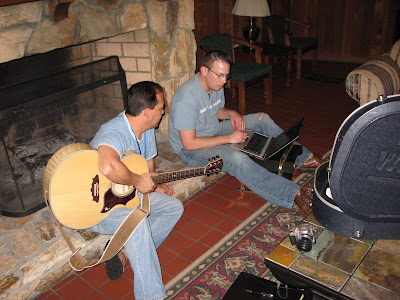Jeremiah Olson (right), who leads music and worship at the Grace Brethren church in Goshen, Indiana, did a little coaching and sharing of music and chords with Javier Forero (left) of Tampa, Florida, after the Tuesday evening session of the Southeast Focus Retreat.