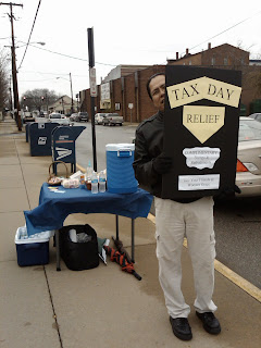 Daron Butler, pastor of cross cultural missions at the Wooster, Ohio, Grace Brethren Church, announces Tax Relief Day outside the post office in Wooster on April 15, when U.S. tax returns are to be in the mail.
